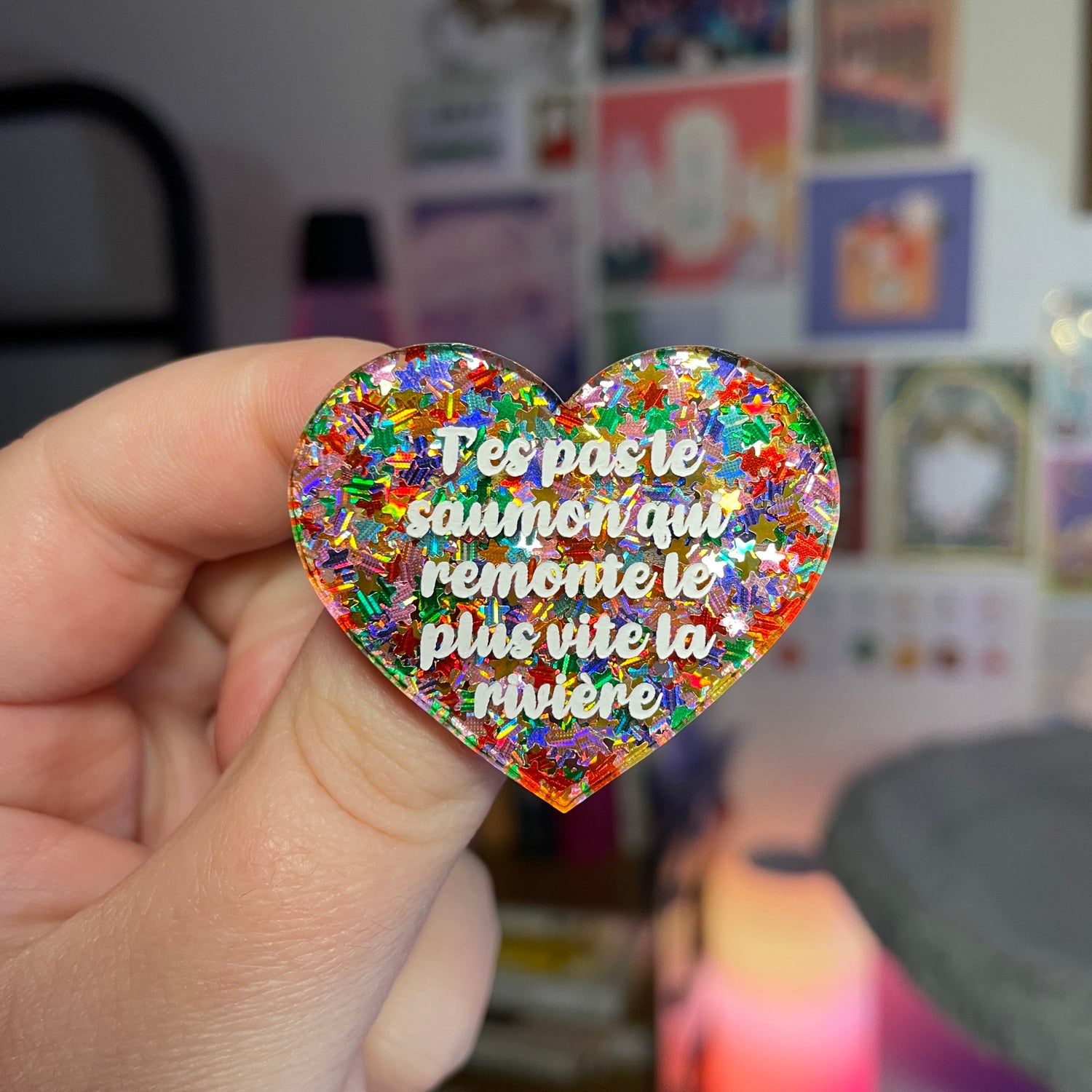 Broche "T'es pas le saumon qui remonte le plus vite la rivière" en acrylique semi transparente avec des étoiles multicolores