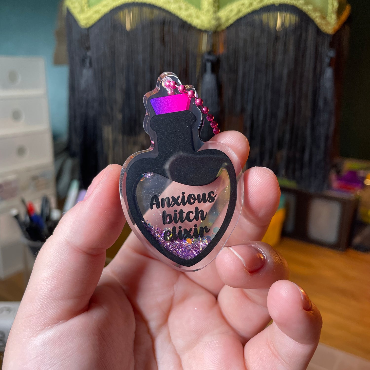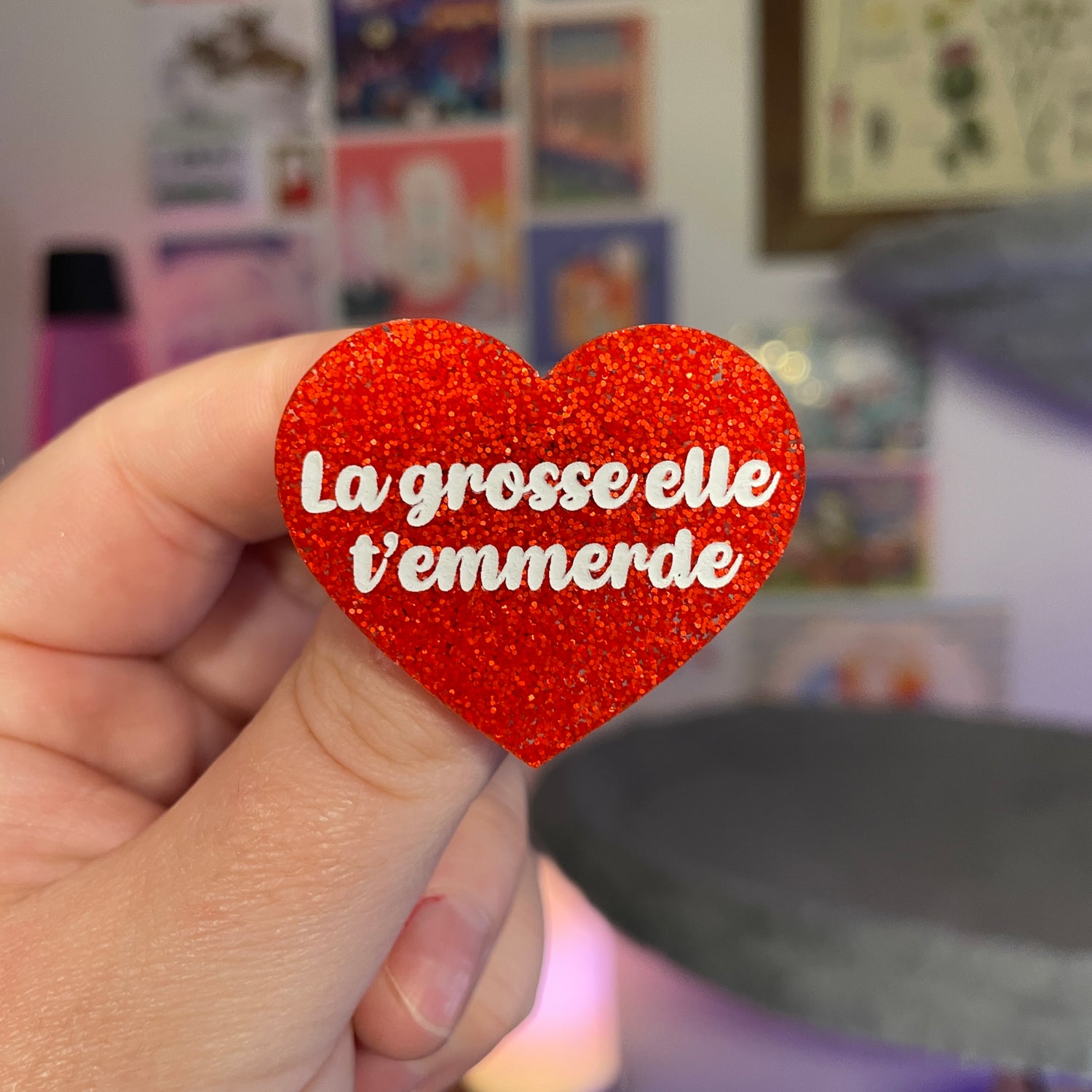 [Contrôle technique] Broche "Les cernes c'est ma DA" en acrylique à paillettes turquoise