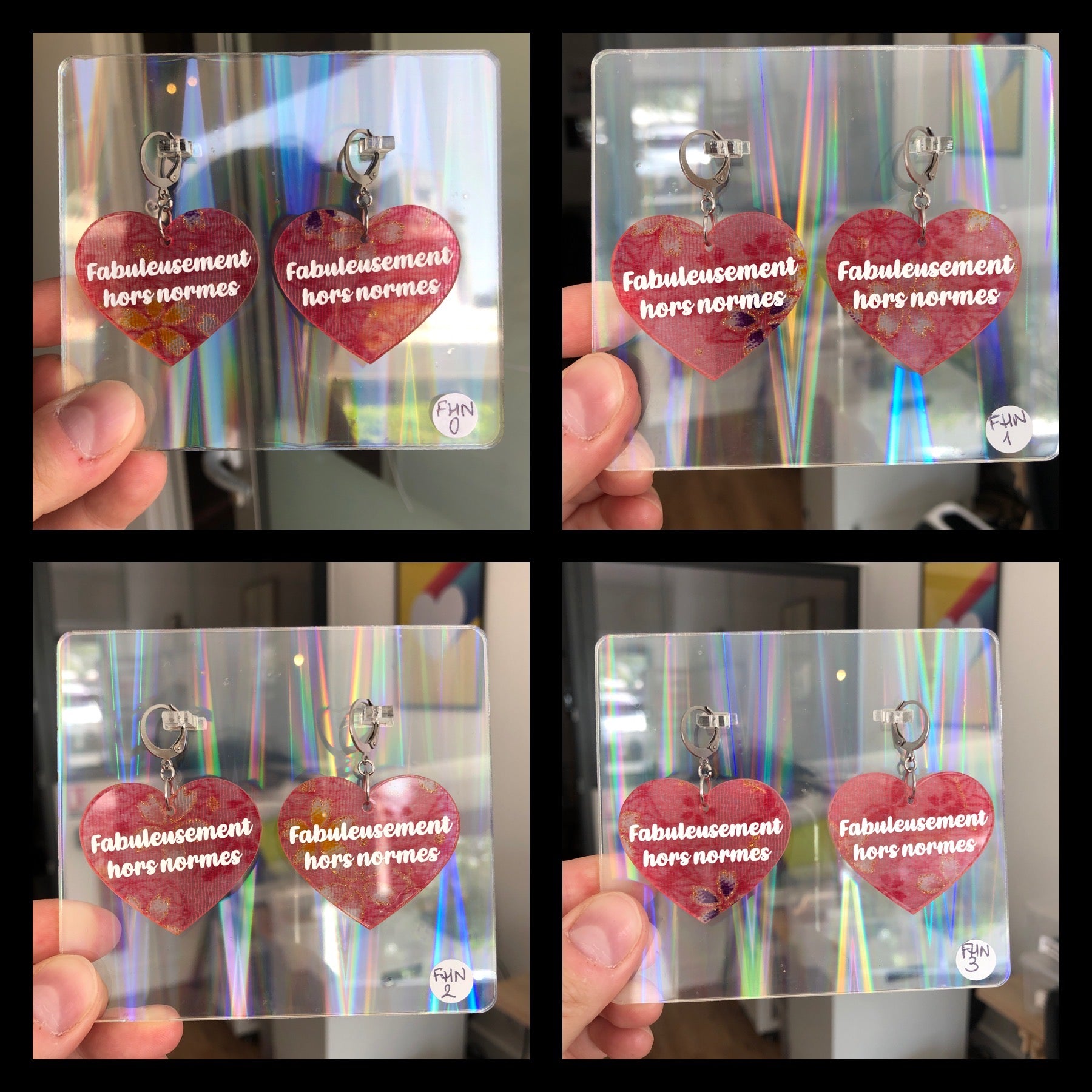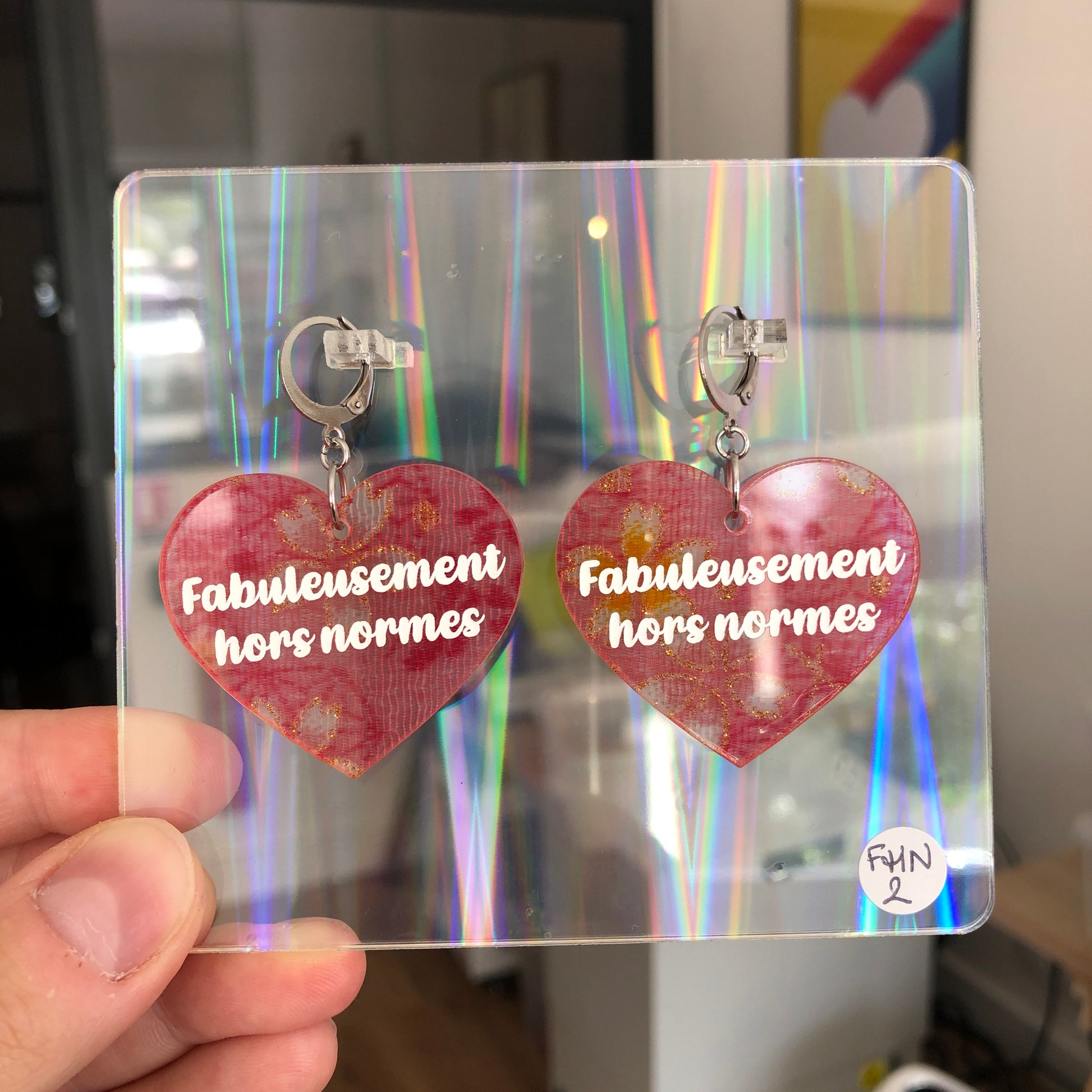 - Produit artisanal : Cette paire de boucles d'oreilles a été faite avec amour par mes petites mains, et de part la nature même de l'acrylique, elle peut avoir de légères rayures ou petits éclats, c'est un produit artisanal. Le texte est peint à la main, la densité de peinture peut-être légèrement irrégulière.
