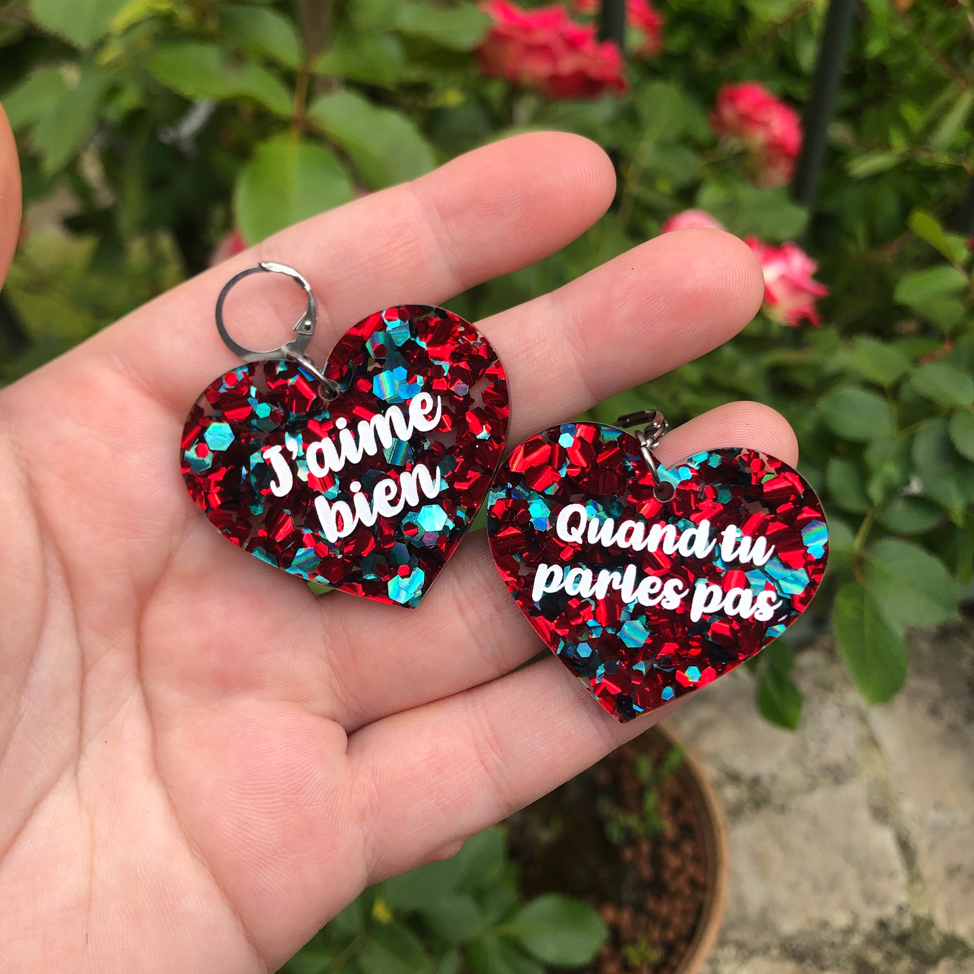 Boucles d'oreilles "J'aime bien" / "Quand tu parles pas" en acrylique à gros confettis rouges et turquoise