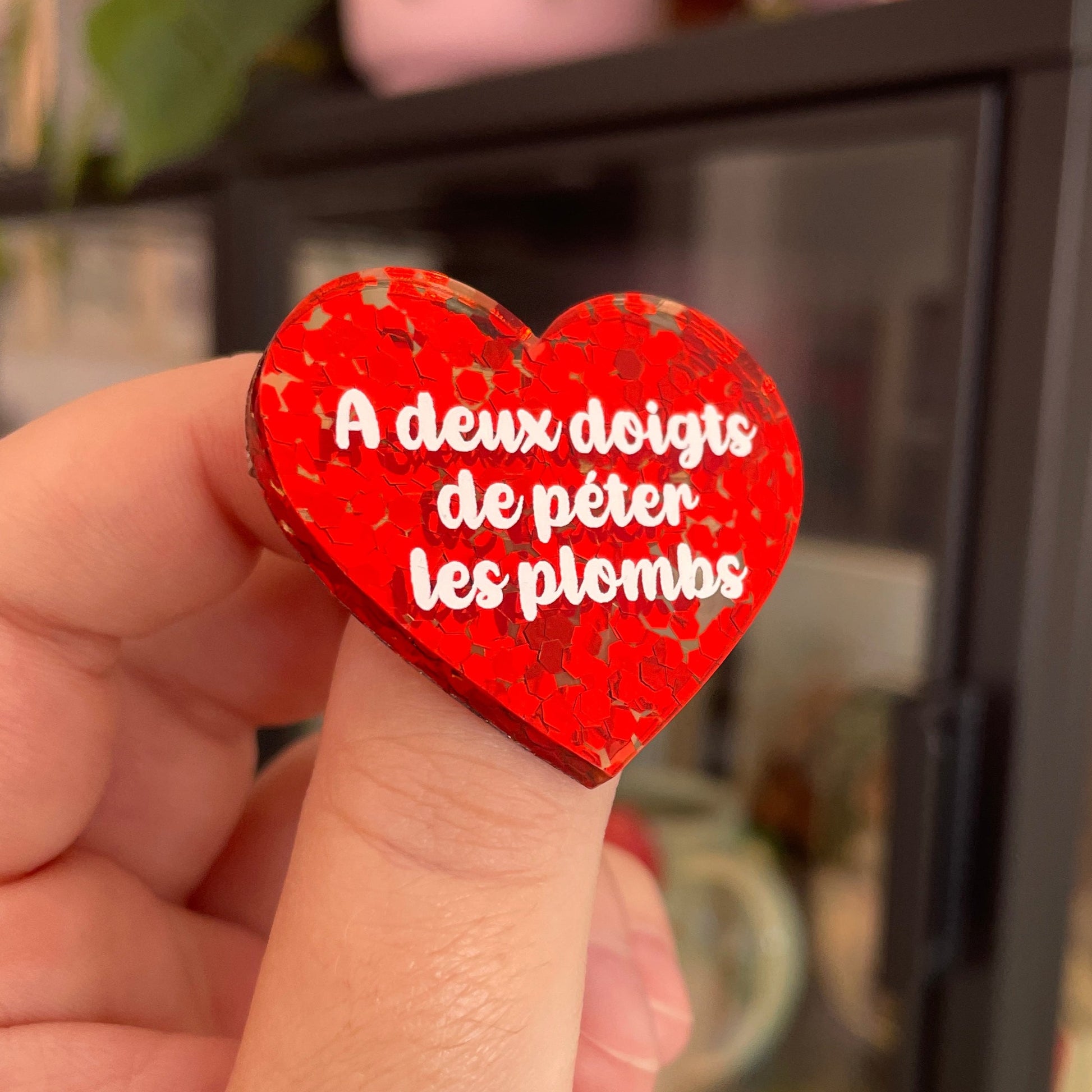 Broche "A deux doigts de péter les plombs" en acrylique semi-transparente avec des confettis rouges