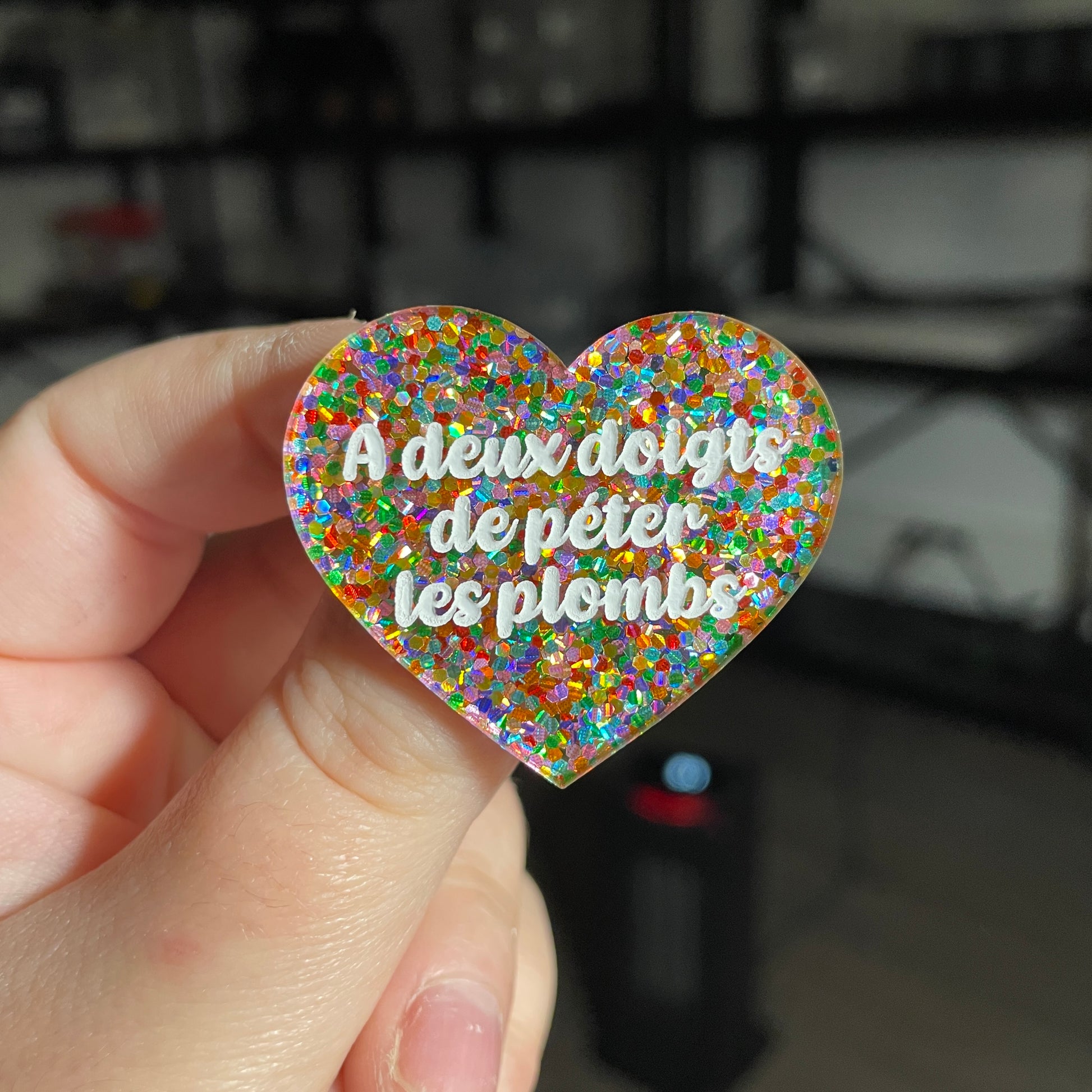 Broche "A deux doigts de péter les plombs" en acrylique semi transparente avec des pois multicolores