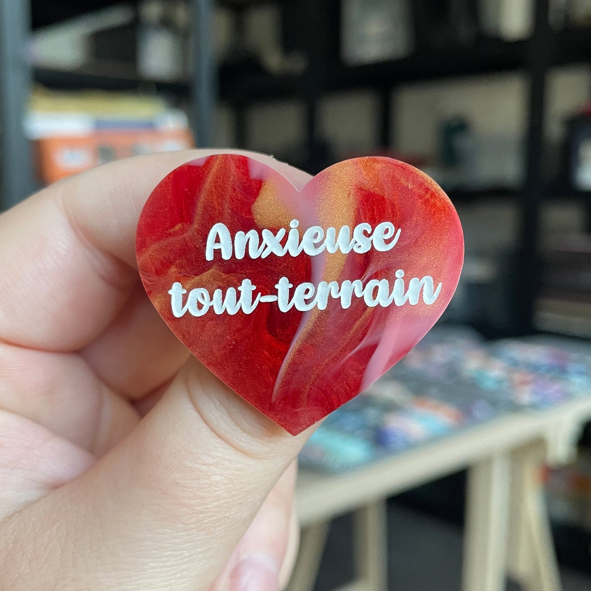 Broche "Anxieuse tout-terrain" en acrylique marbrée rouge, blanche et dorée