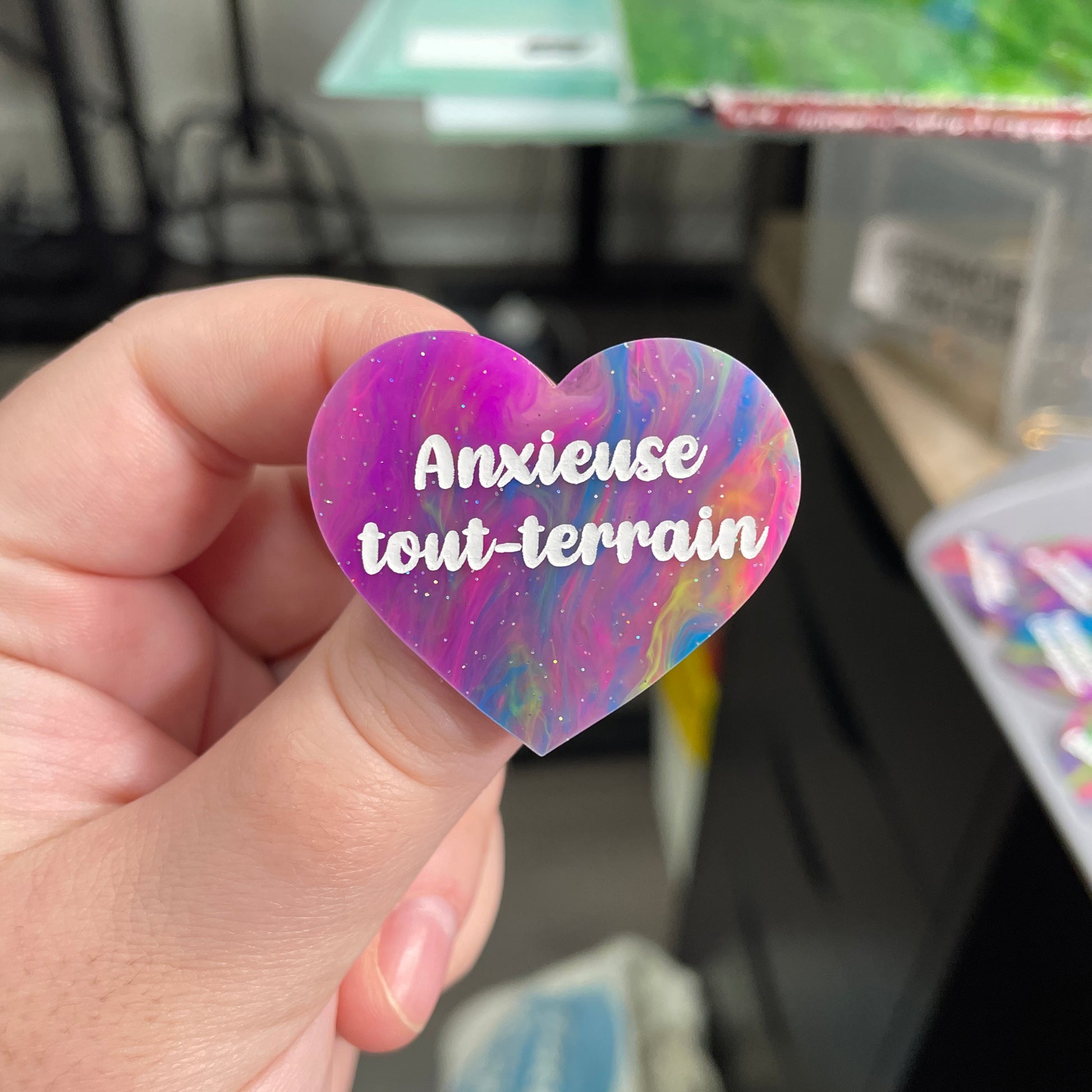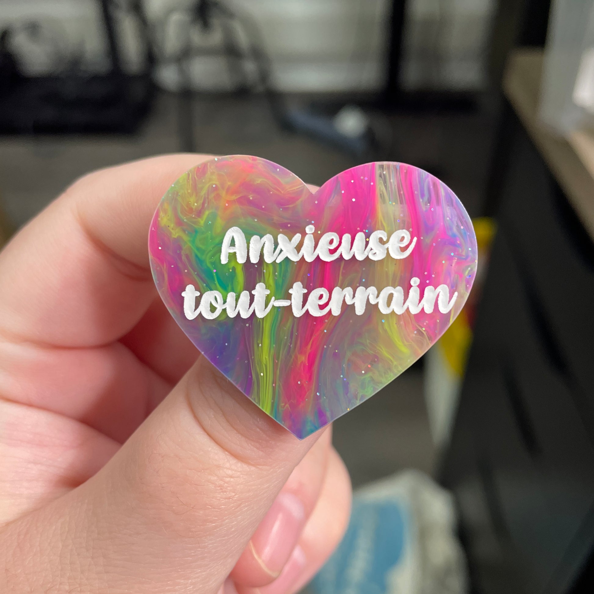 Broche "Anxieuse tout-terrain" en acrylique semi-transparente marbrée multicolore
