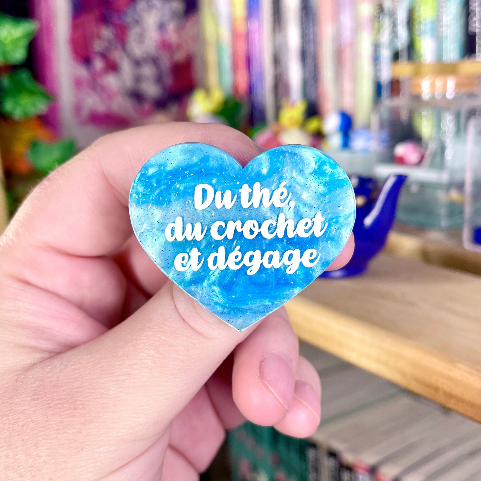 Broche "Du thé, du crochet et dégage" en acrylique marbrée bleue à paillettes