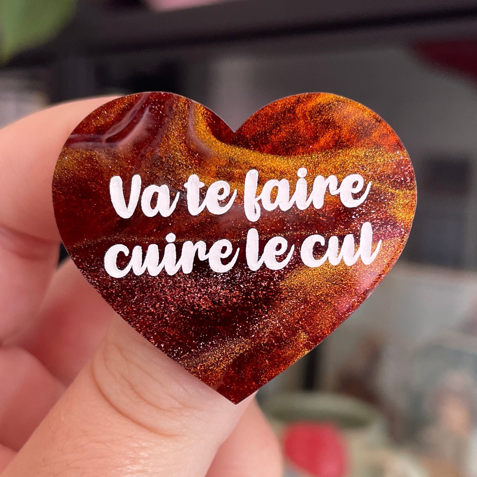 Broche "Va te faire cuire le cul" en acrylique marbrée marron et dorée