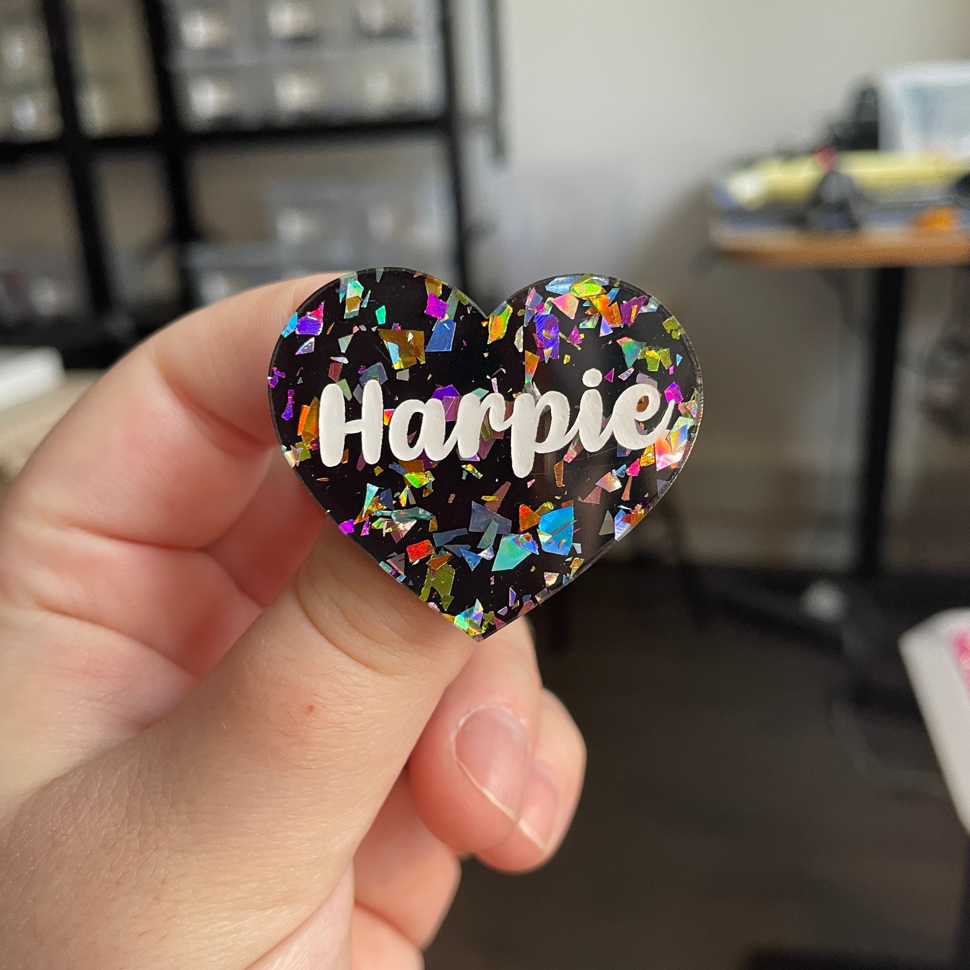 [CONTRÔLE TECHNIQUE] Broche "Harpie" en acrylique noire avec des éclats de confettis multicolores