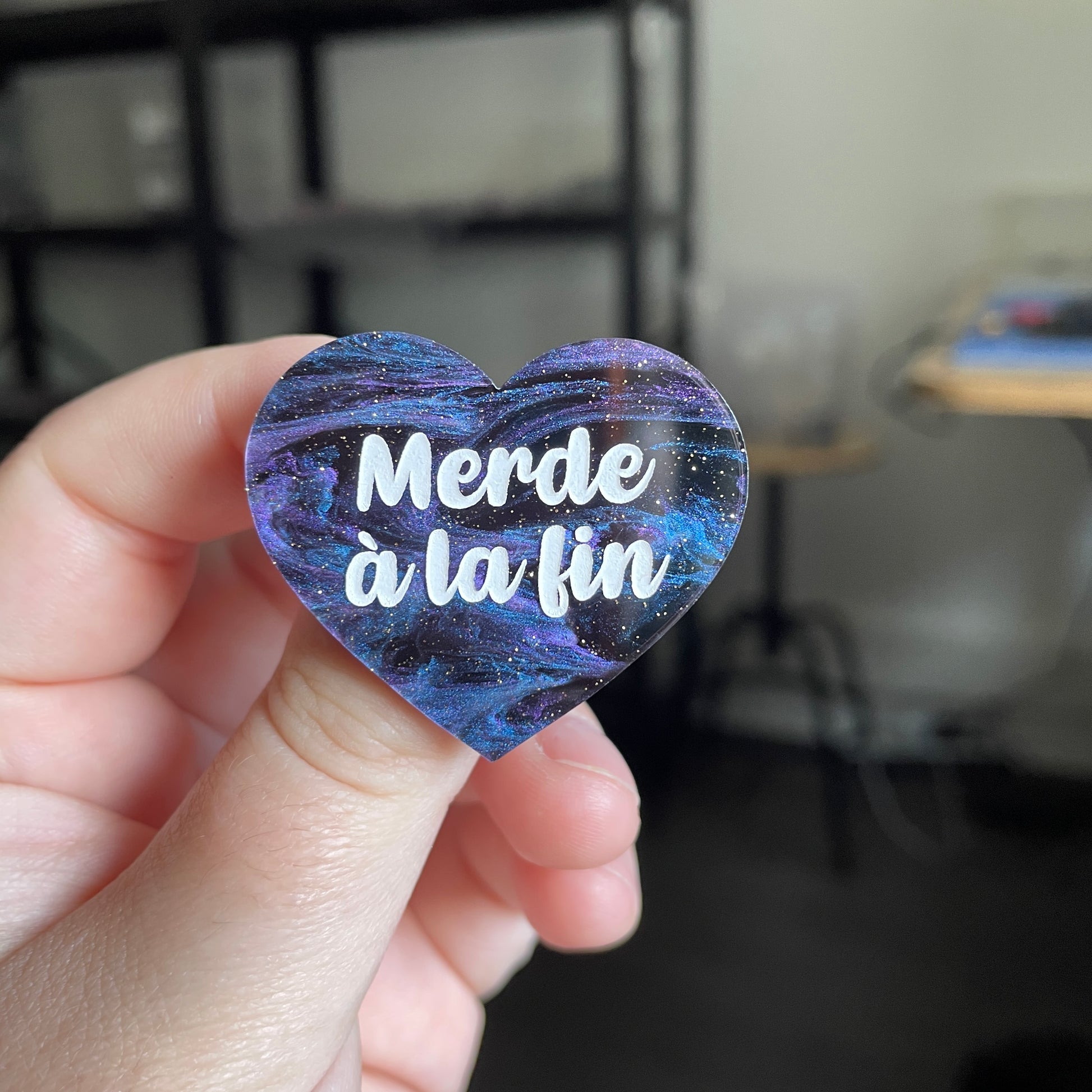 [CONTRÔLE TECHNIQUE] Broche "Merde à la fin" en acrylique marbrée noire, bleue et violette à paillettes