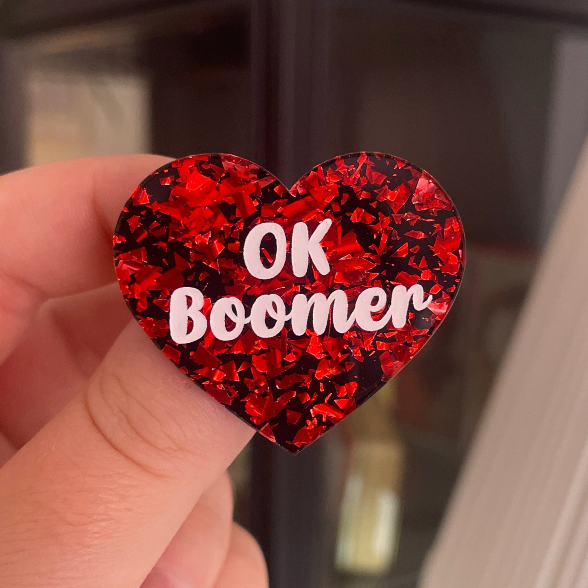 [CONTRÔLE TECHNIQUE] Broche "OK boomer" en acrylique noire avec des éclats de confettis rouges