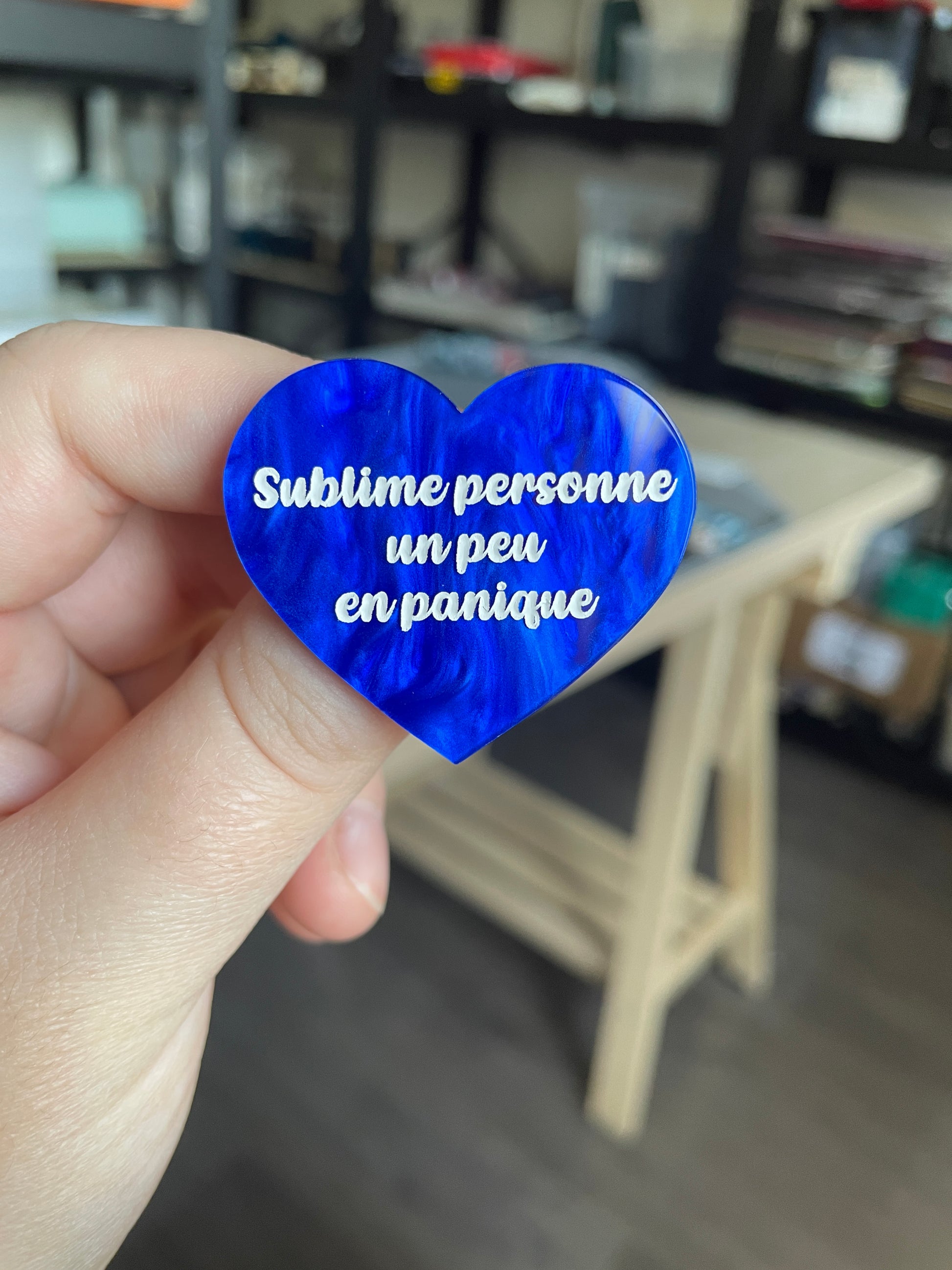 [CONTRÔLE TECHNIQUE] Broche "Sublime personne un peu en panique" en acrylique marbrée bleue