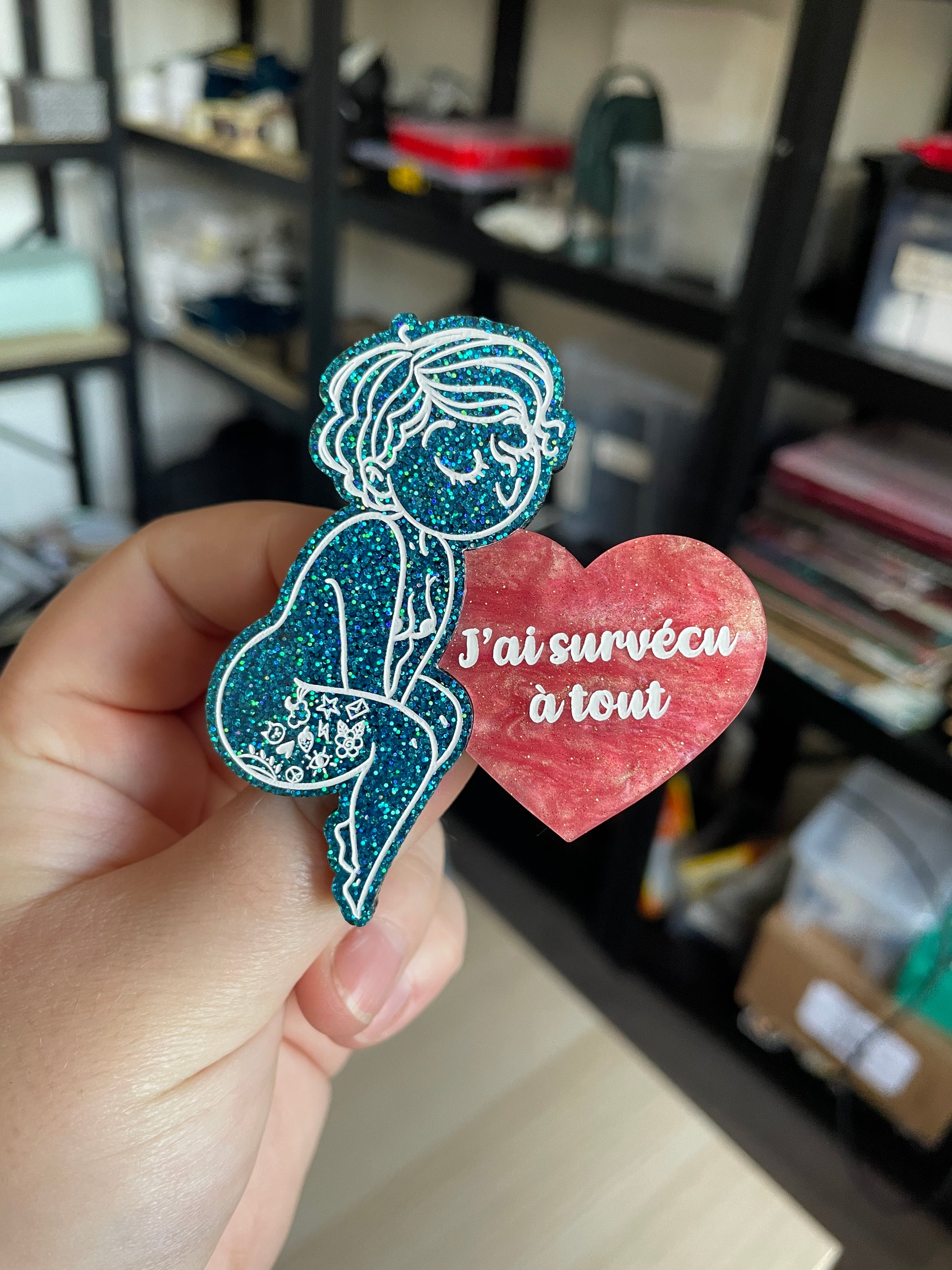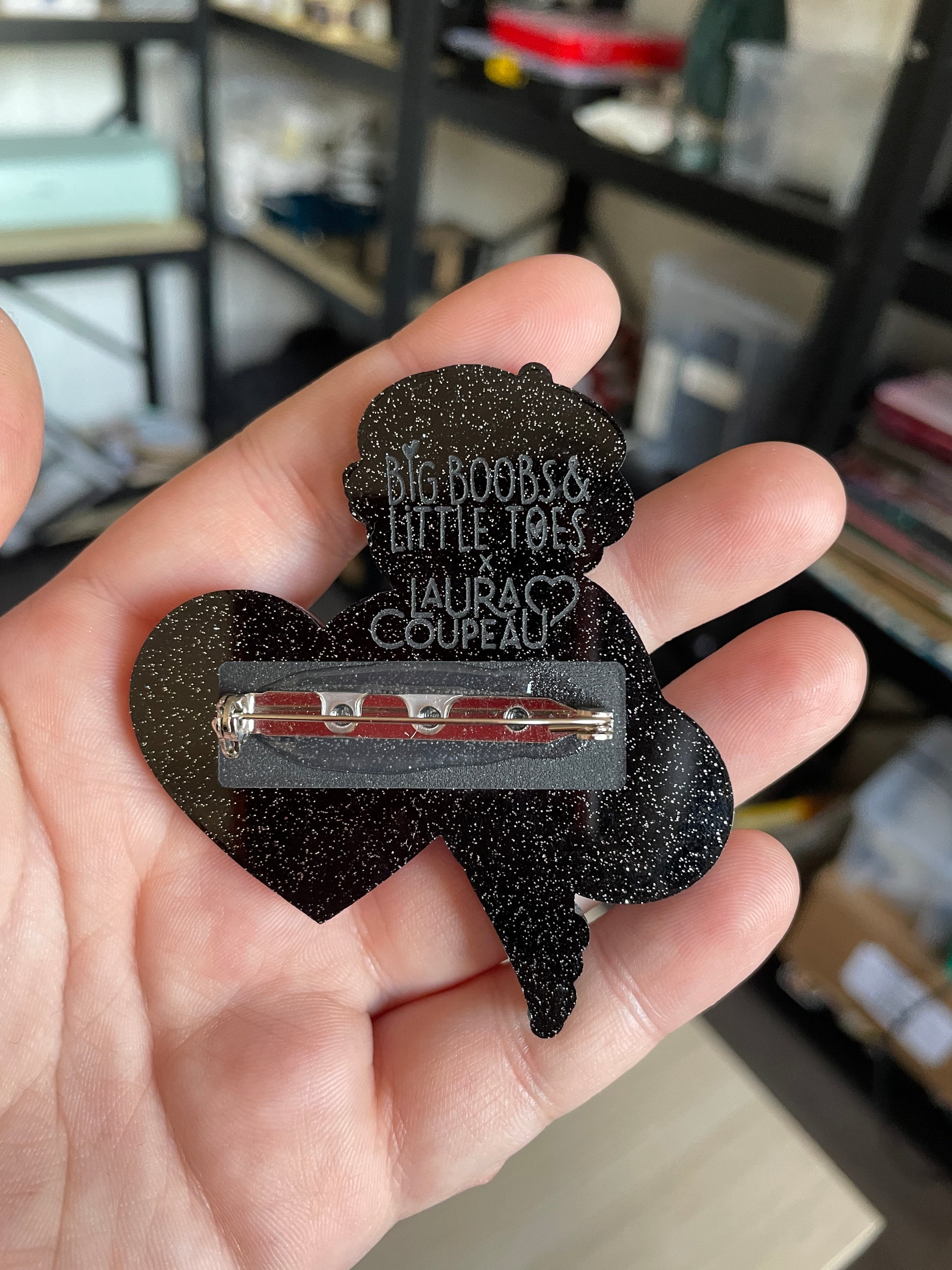 Voici l'une des deux broches faites en collaboration avec l'illustratrice douce et talentueuse Big Boobs and Little Toes. Elle a dessiné ces deux petites personnes, et j'en ai fait deux créations en acrylique. Nous souhaitons avec ces broches vous apporter force et douceur.