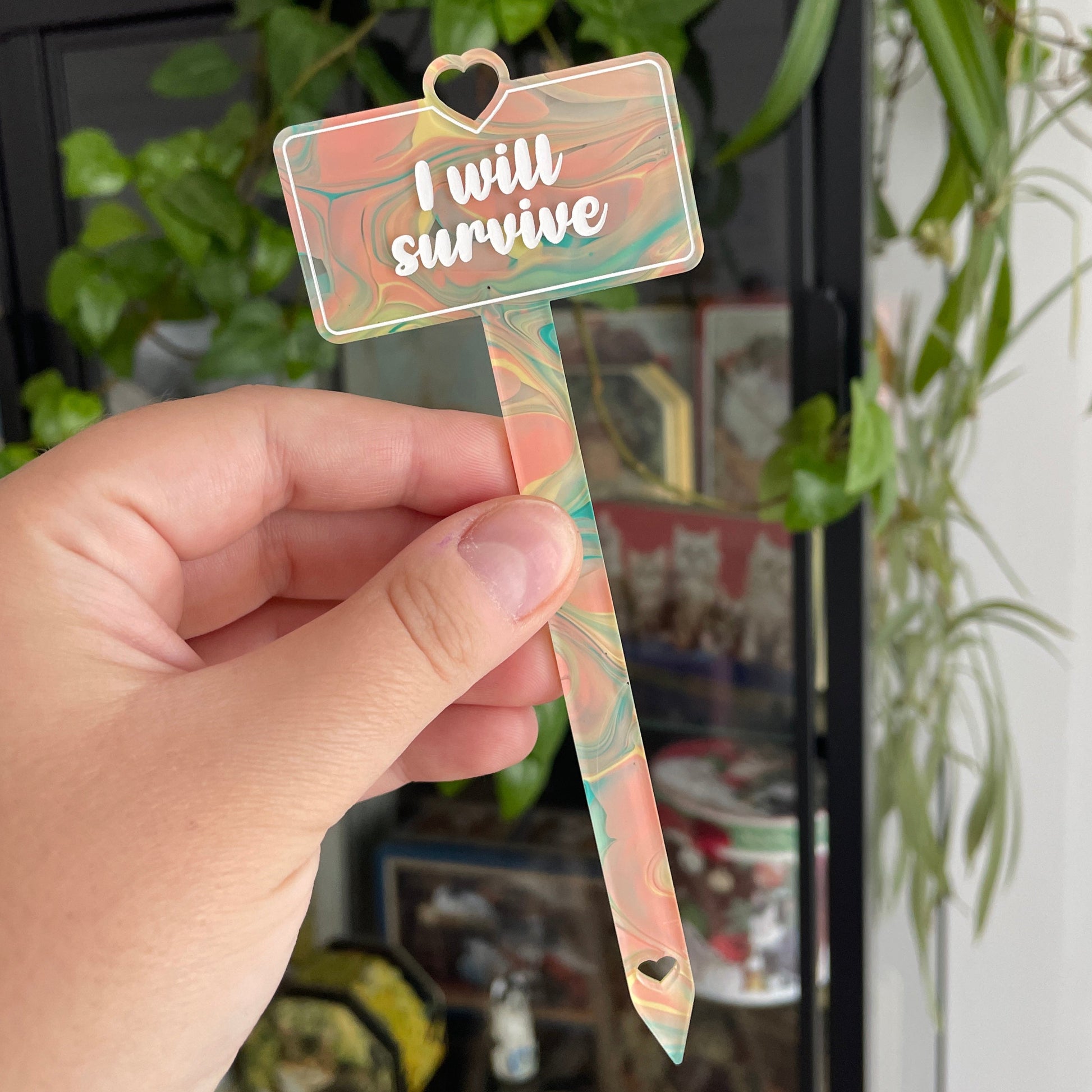 [CONTRÔLE TECHNIQUE] Pic à plante "I will survive" en acrylique transparente marbrée jaune, verte et corail