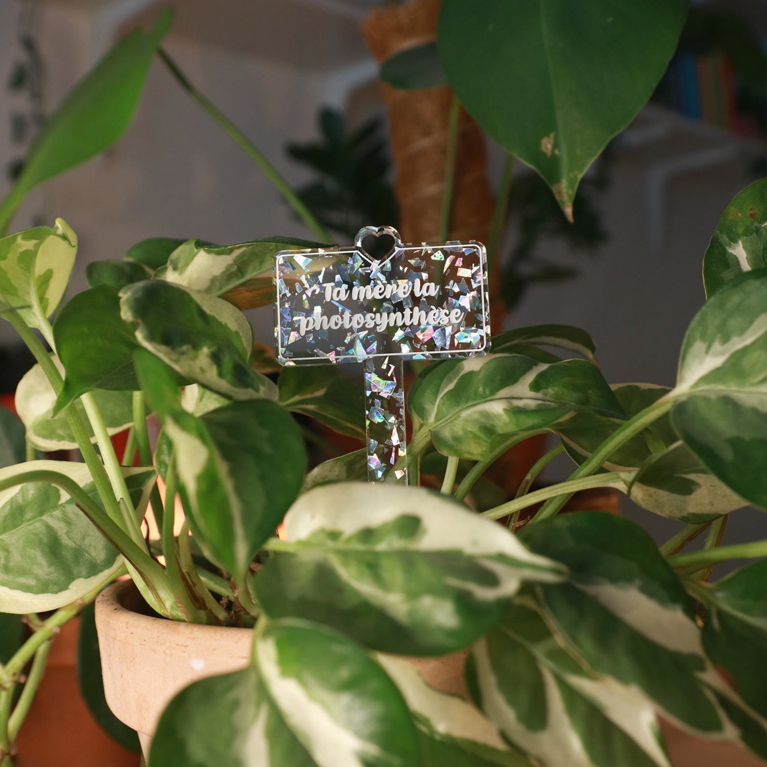 [CONTRÔLE TECHNIQUE] Pic à plante "Ta mère la photosynthèse" en acrylique transparente avec des éclats de confettis argentés