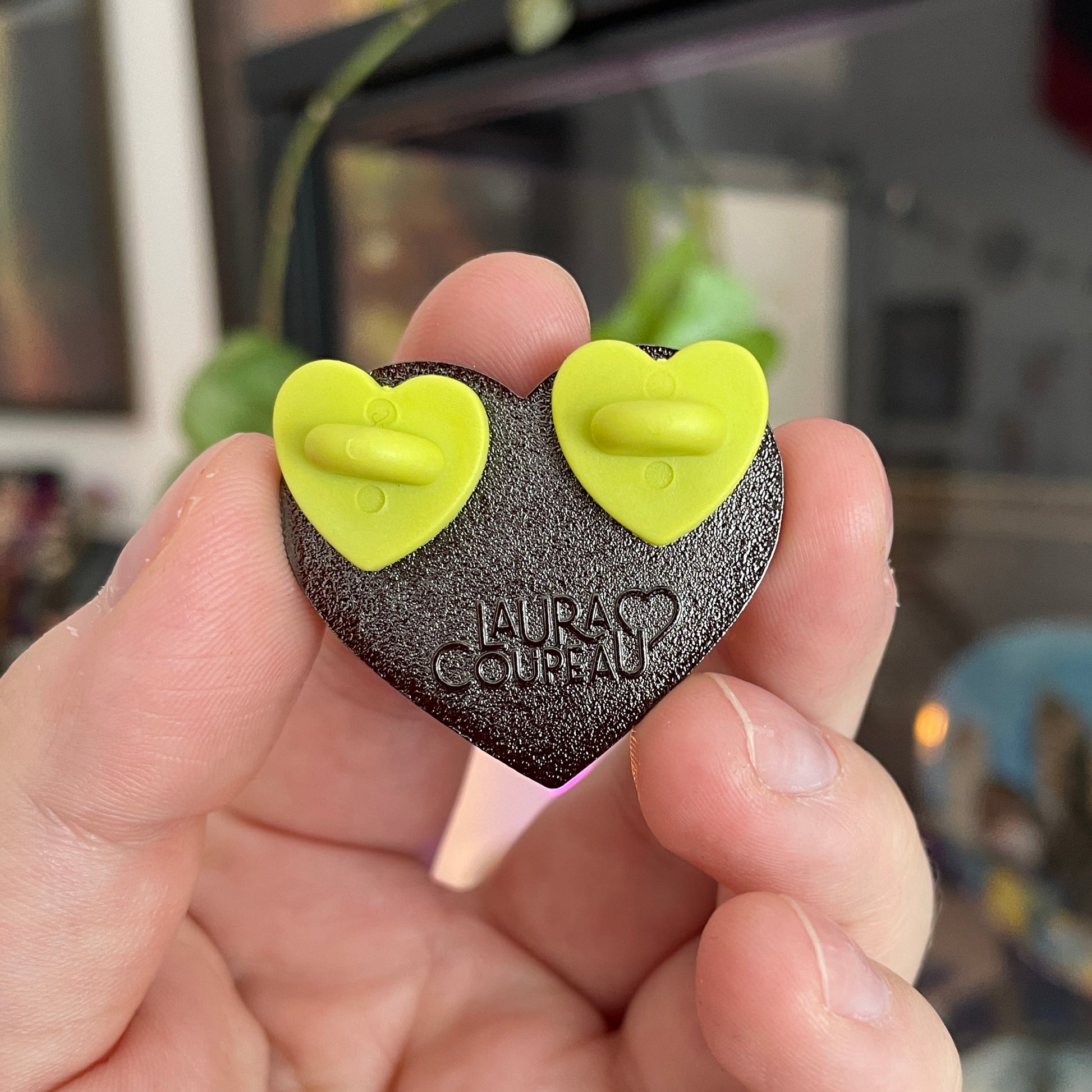 - Deux fermoirs en caoutchouc en forme de cœur rouge sont placés derrière.