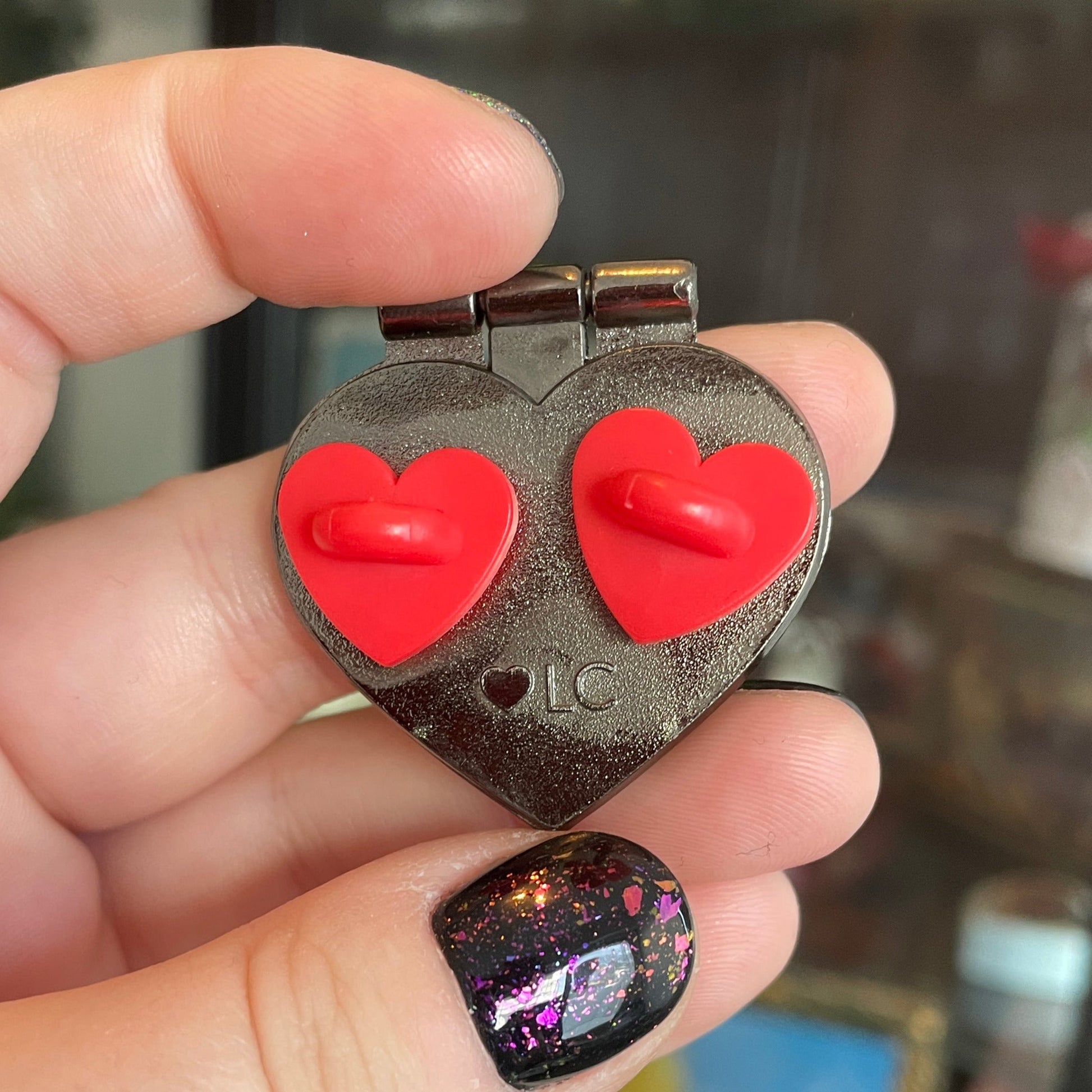 - Deux fermoirs en caoutchouc en forme de cœur rouge sont placés derrière (+ 2 pin lockers offerts)