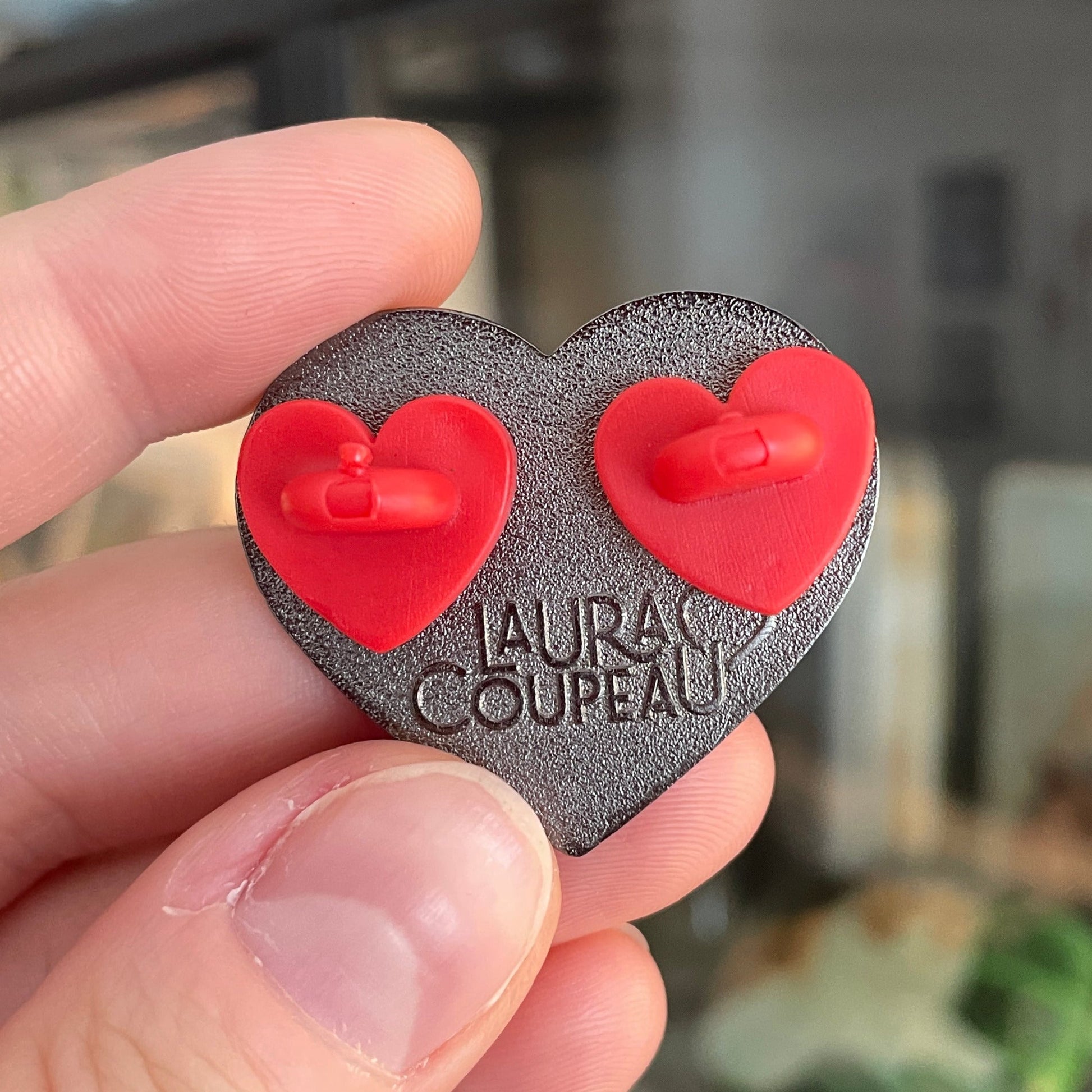 - Deux fermoirs en caoutchouc en forme de cœur rouge sont placés derrière.