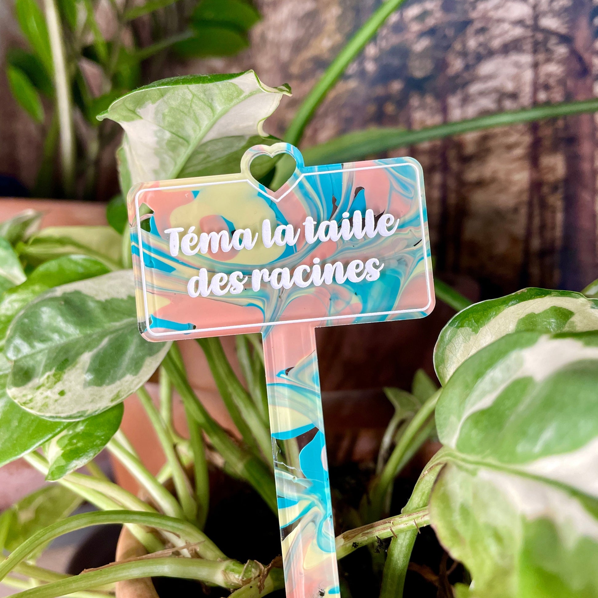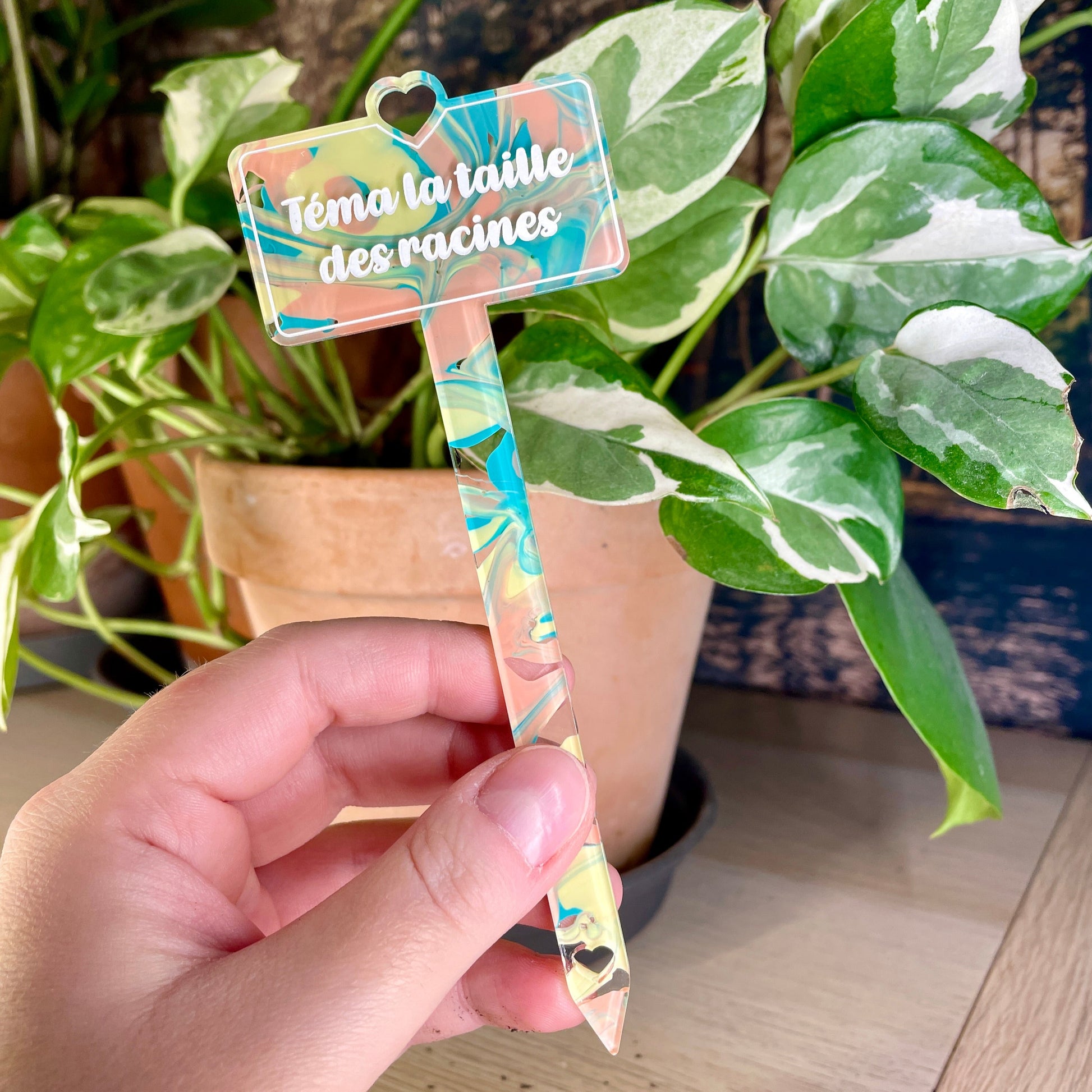 Pic à plante "Téma la taille des racines" en acrylique marbrée pastel jaune, verte et corail