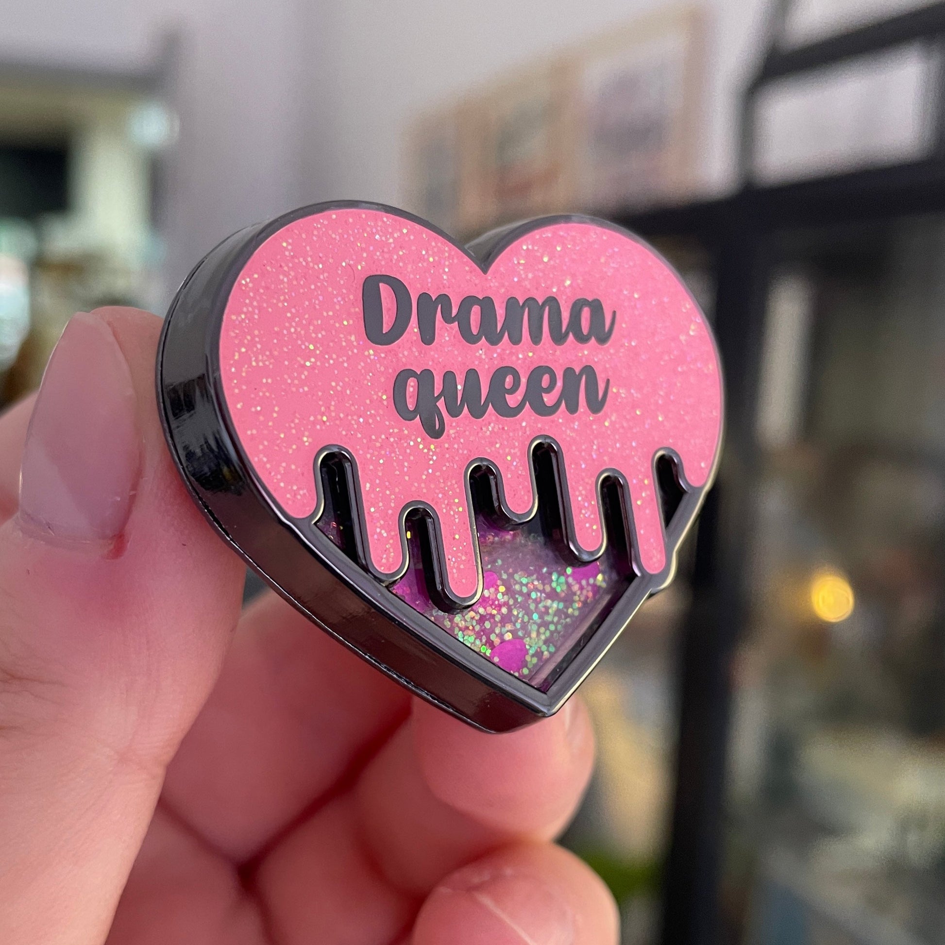 Pin en émail "Drama queen" rose à paillettes et paillettes liquides