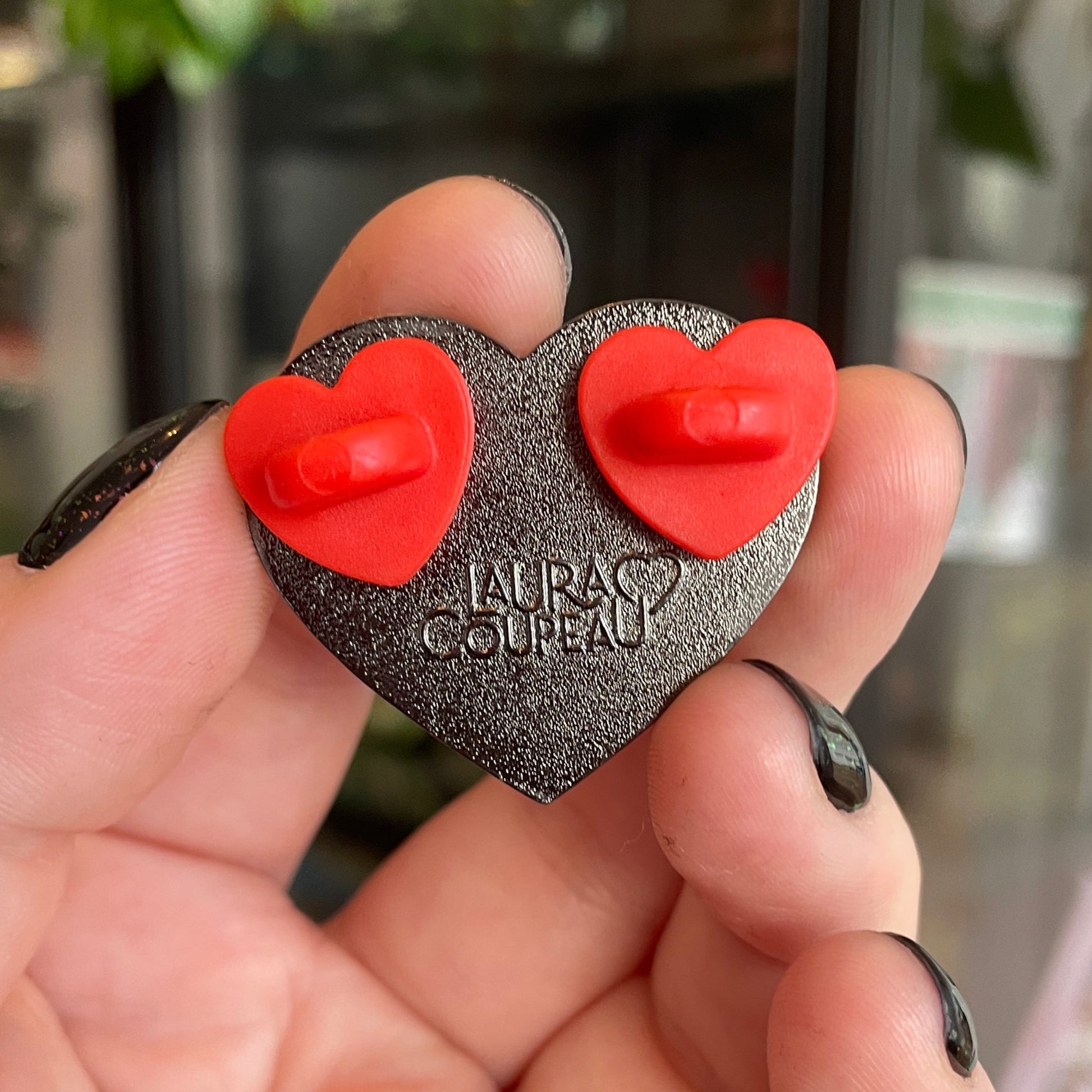 - Deux fermoirs en caoutchouc en forme de cœur rouge sont placés derrière.
