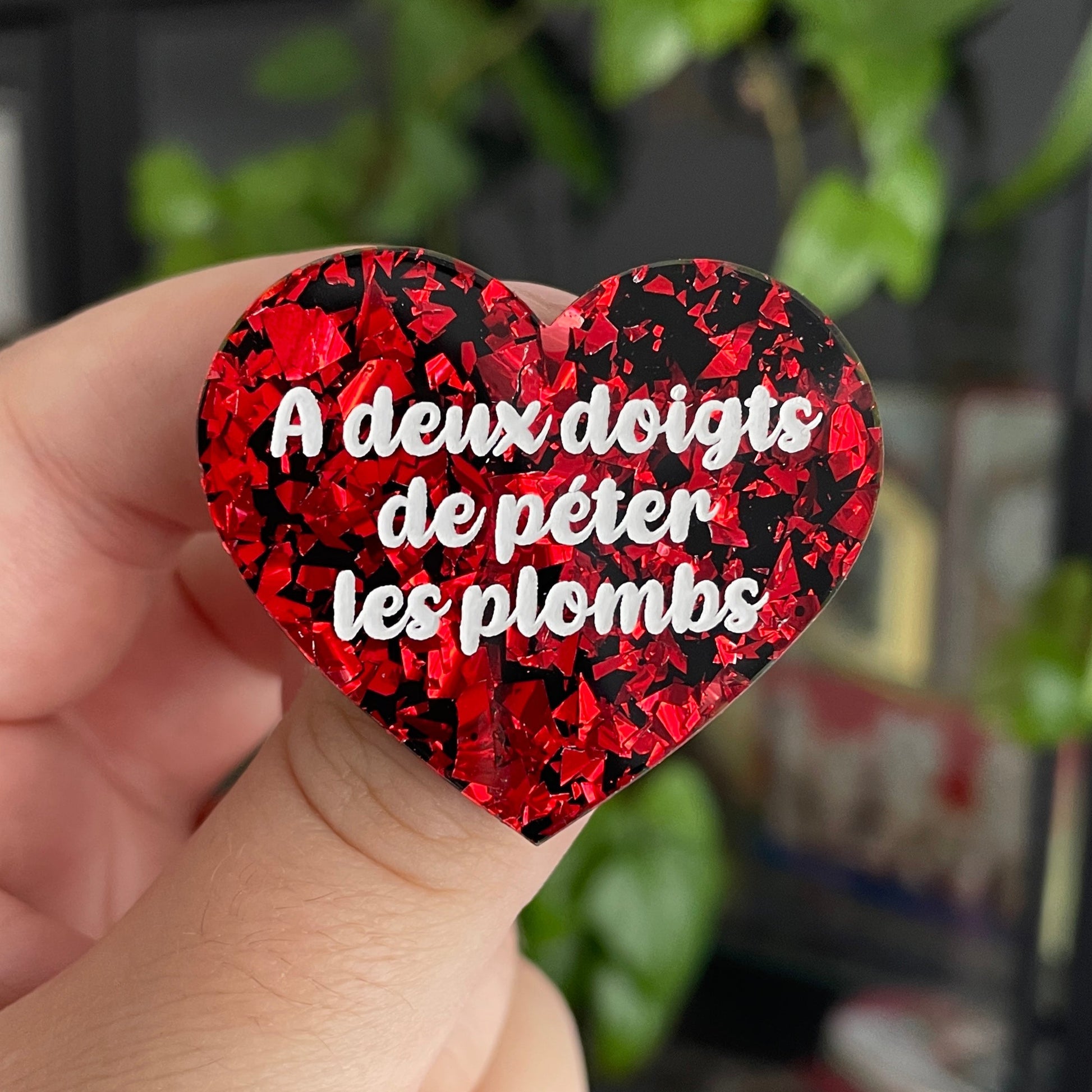 Broche "A deux doigts de péter les plombs" en acrylique noire avec des éclats de confettis rouges